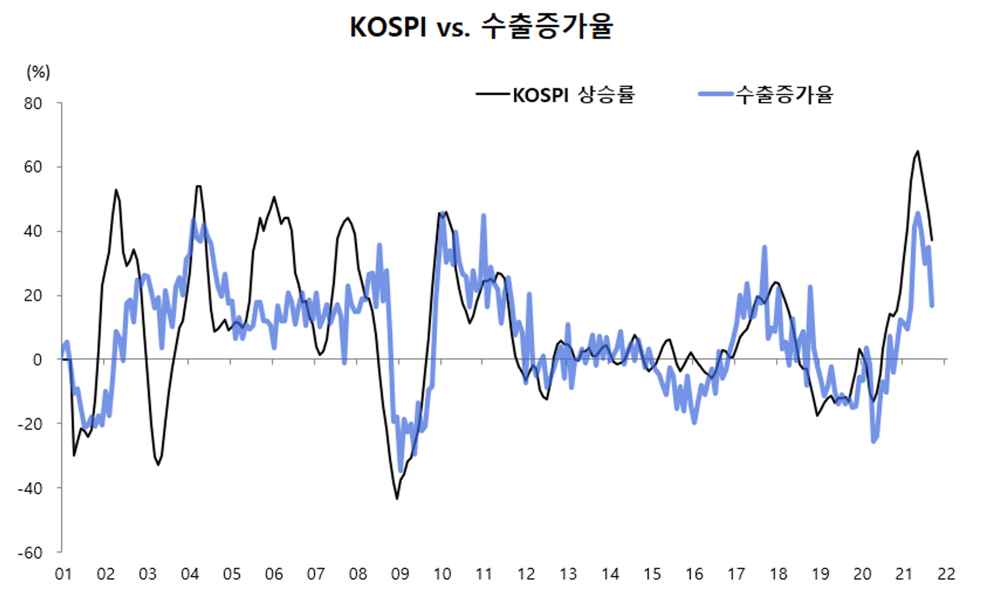 한국 주식시장의 성과를 좌우하는 가장 결정적인 요인은 수출이다.