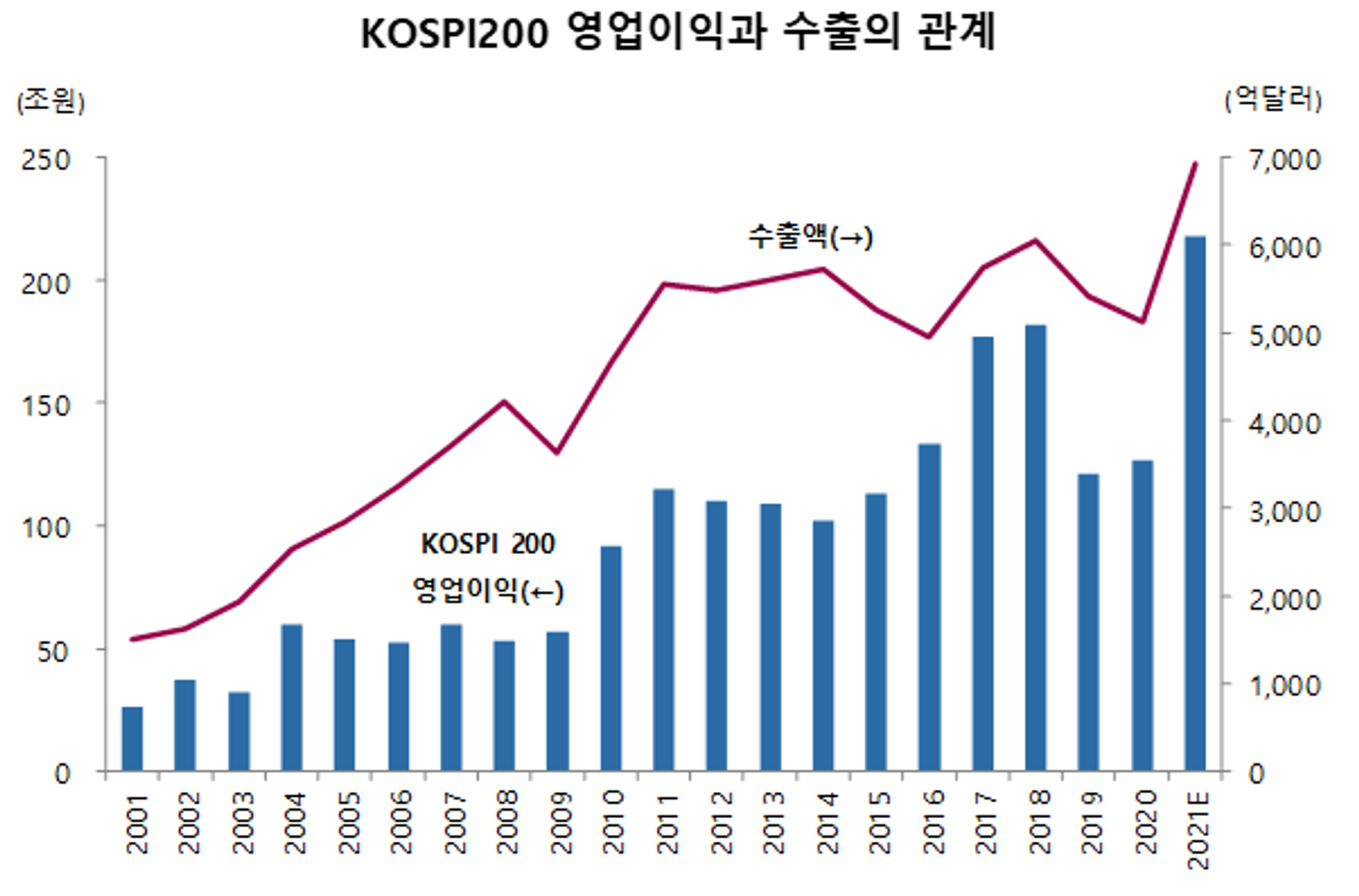<그림 2> KOSPI200 영업이익과 수출의 관계