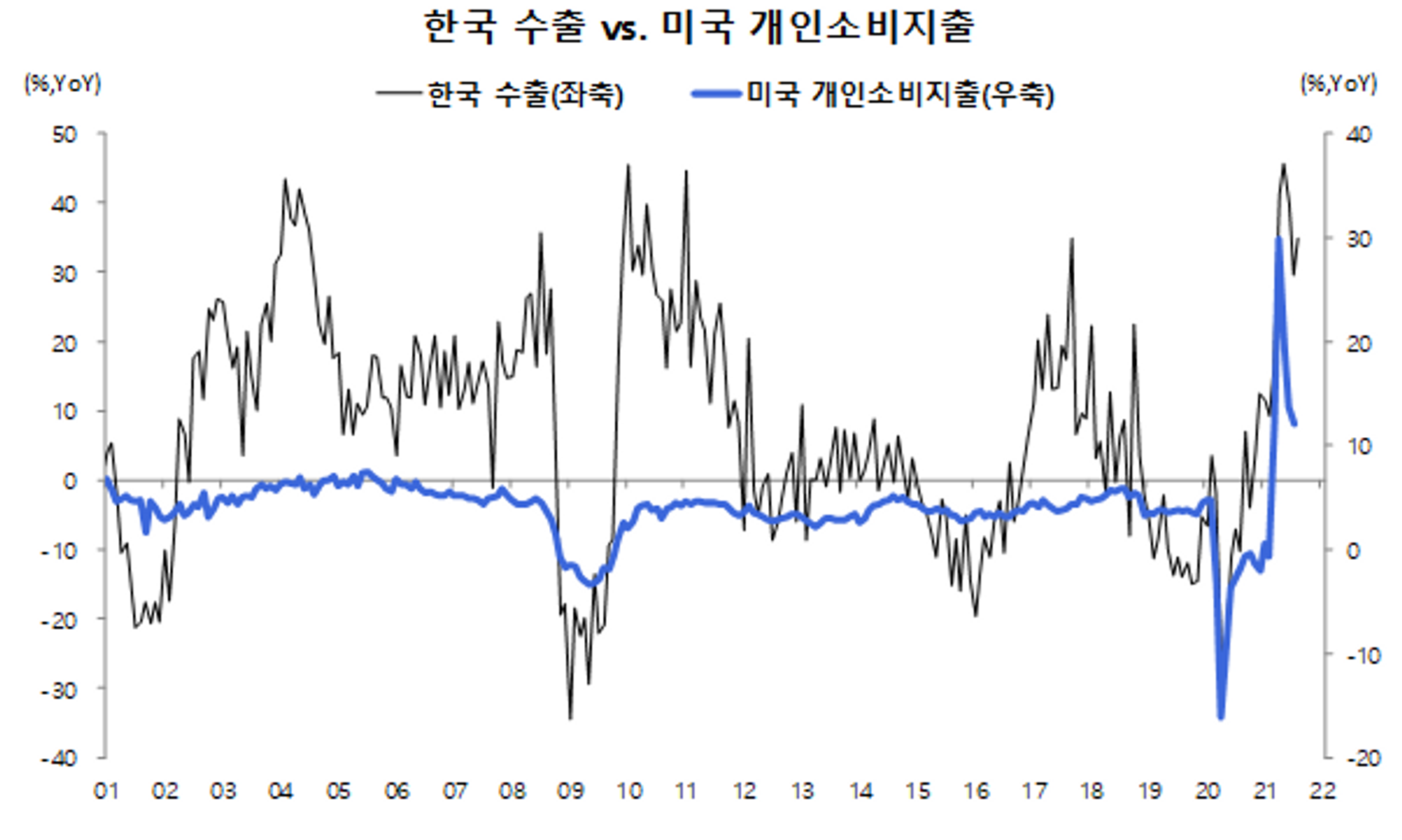 <그림 3> 한국 수출 vs 미국 개인소비지출