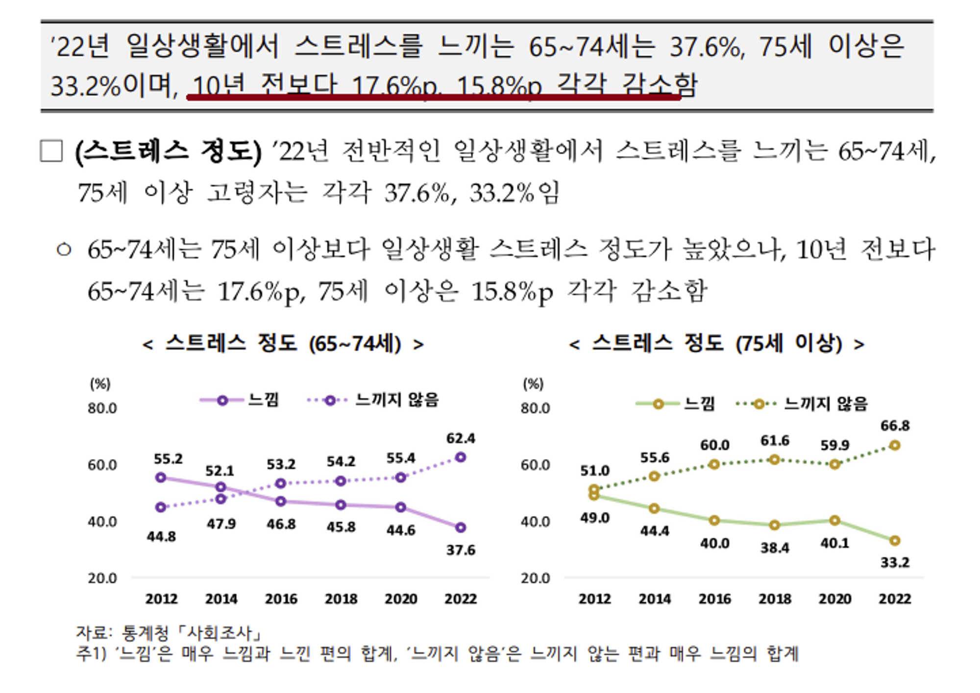 ‘스트레스를 느낀다’고 답한 65~74세 인구 비중은 단 47.6%에 그쳤으며, 75세 이상 인구의 비중은 33.2%에 불과했기 때문입니다.