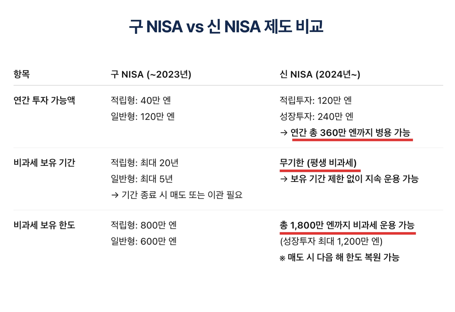 파격적인 일본 신NISA의 변화: 평생 비과세 제도 도입과 연간 투자 한도의 대폭 상향(360만 엔)을 통해, 기간 제한 걱정 없이 꾸준히 자산을 굴릴 수 있는 장기 투자 환경을 성공적으로 구축했습니다.