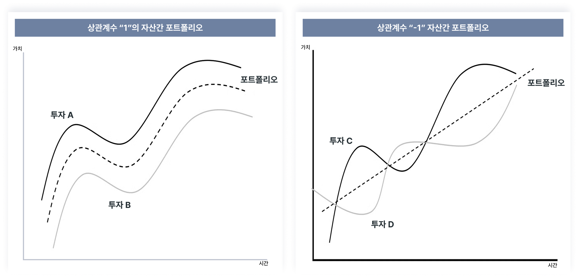 - 상관계수가 +1에 가까운 자산은 같은 방향으로 움직이기 때문에 분산 효과가 거의 없습니다.