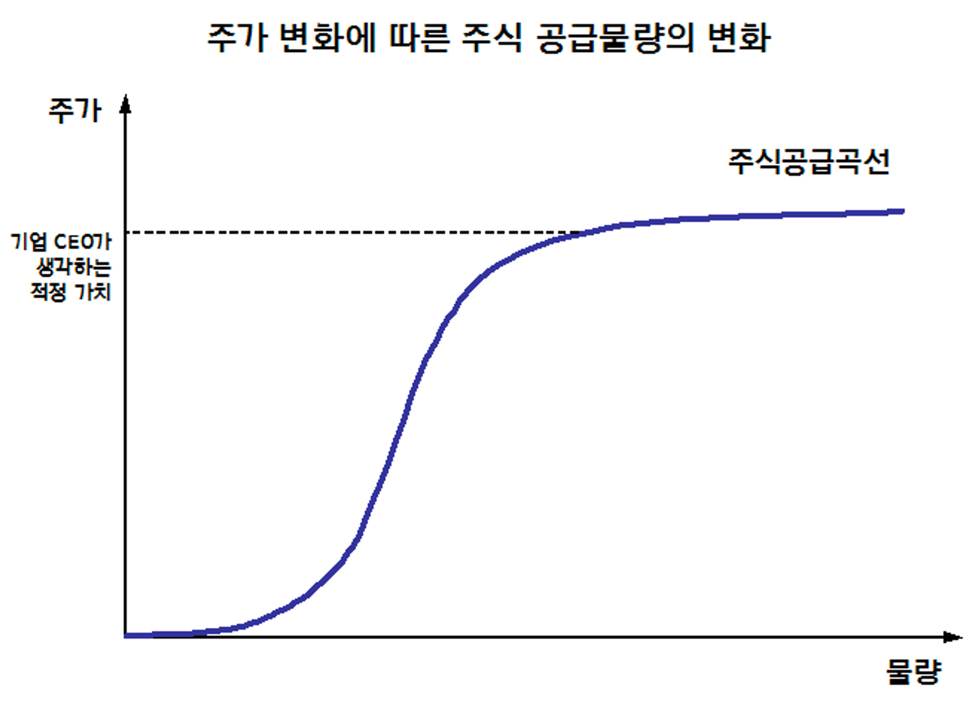 예를 들어 주가수익 배율(PER)이 50배에 이르는 기업 A를 생각해보자. A기업은 미래 전망이 밝은 투자 프로젝트를 가지고 있어 자금 조달이 필요한 데, 시장금리가 5% 이상일 때 은행에서 대출받지 않을 것이다. 왜냐하면 A기업의 주가 수익률(Yield Ratio, 이익/주식가격x100)이 2%에 불과하기에, 최고경영자 입장에서 대출보다 증자가 훨씬 유리한 선택일 것이기 때문이다, A기업의 경영자 입장에서 자기 회사 주식의 기대 수익률이 계속 낮아지는데 시장금리가 상승하니, 대출보다는 증자가 훨씬 이익이 된다. 결국 CEO가 생각하는 적정가치 이상으로 주가가 상승하면(Yield Ratio<시장금리), 주식 공급이 무한하게 늘어날 것이다.