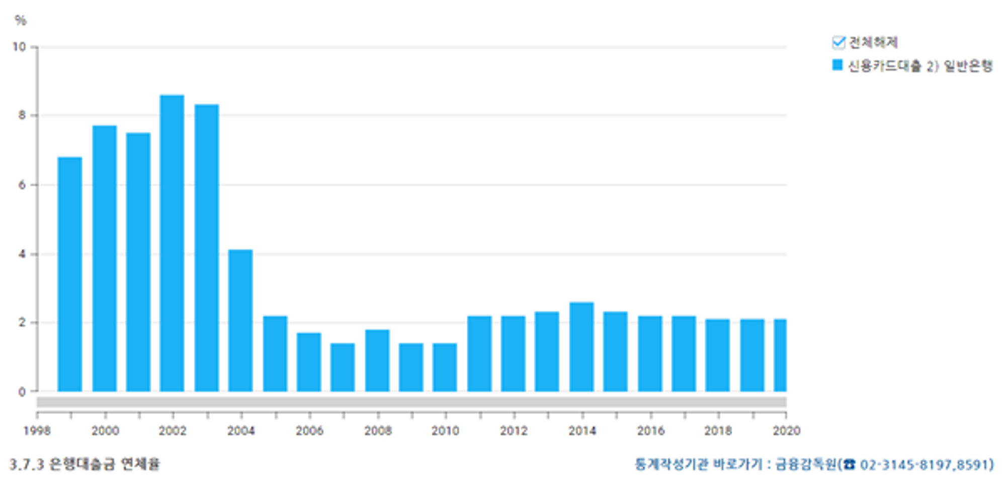 <그림> 1998년 이후 한국 은행권 신용카드 연체율 추이