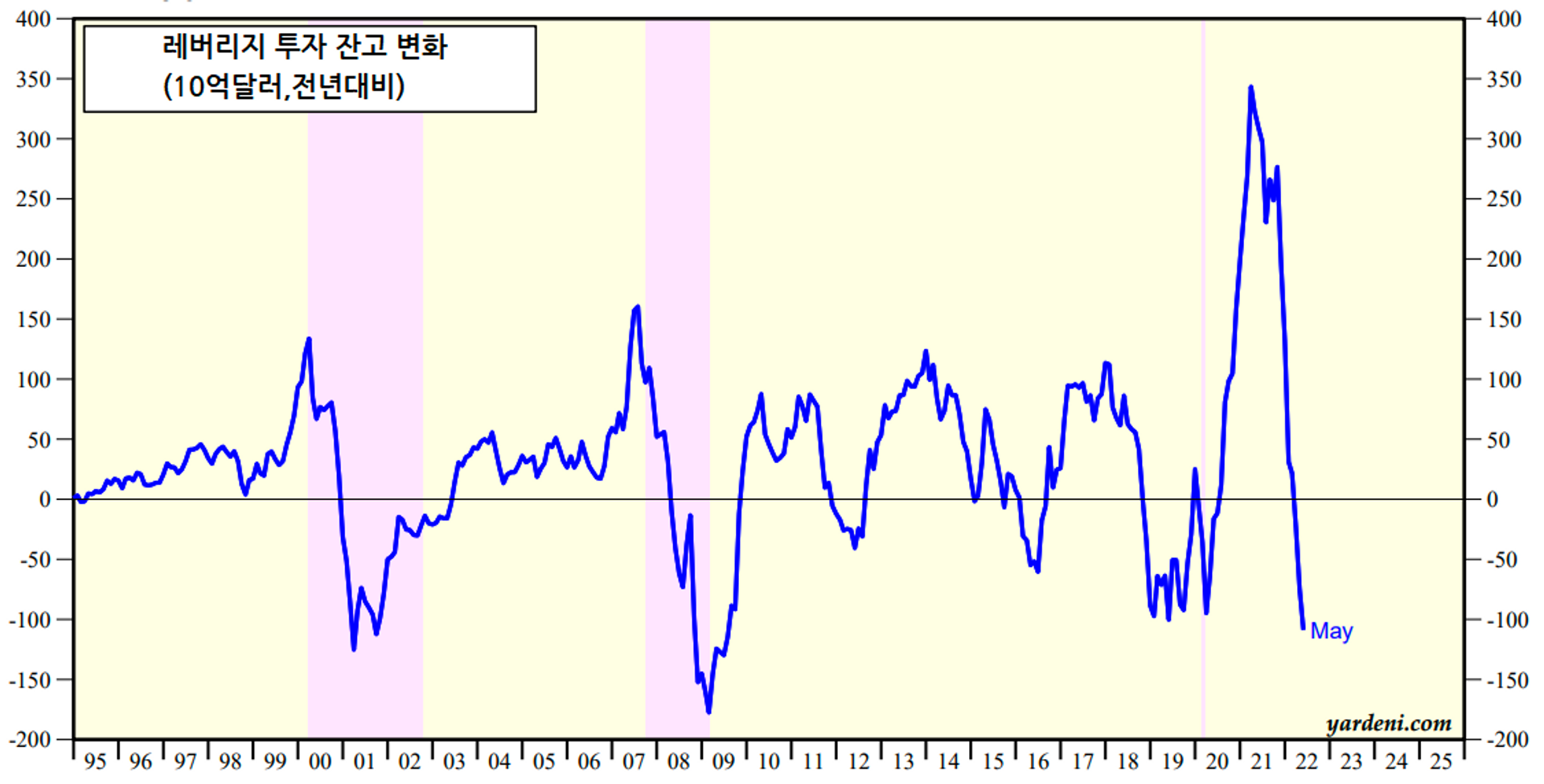 아래의 <그림 2>는 미국의 레버리지 투자 변화를 보여주는데, 지난 해 같은 기간에 비해 무려 1천억 달러의 레버리지 투자 잔고 감소를 발견할 수 있습니다. 즉, 돈 빌려 갔다 원금을 갚지 못해 청산(=Margin Call)당한 돈이 이렇게 많다는 이야기입니다.