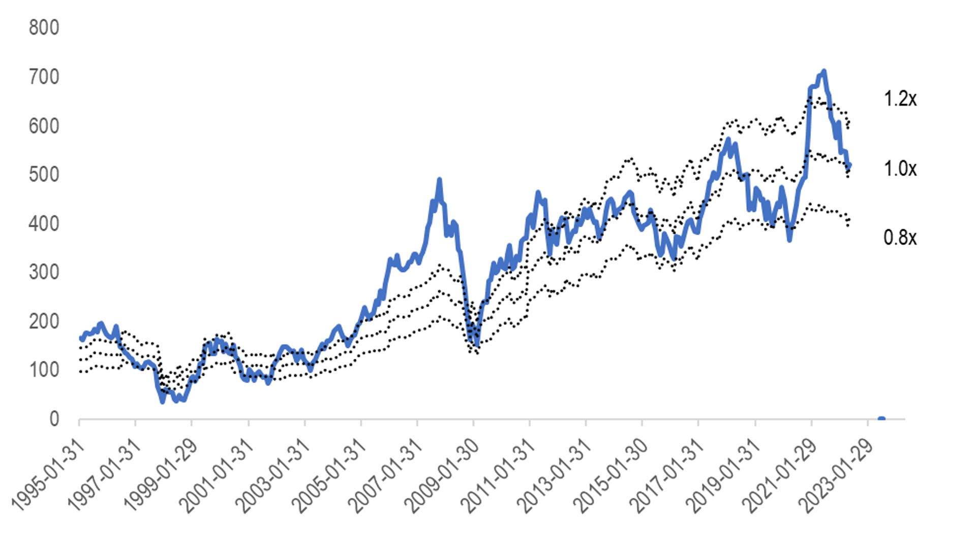 아래 <그림 3>은 한국의 주당 순자산가치 대비 주가배율(PBR) 흐름을 보여줍니다. 1995년 이후 한국의 평균 PBR이 1.12배인데, 2022년 5월 말 1.01배이니 역사적인 평균에 비해 9.8% 저평가된 상황입니다. 그런데, 6월의 폭락으로 5월 말에 비해 주가가 11.9% 하락한 것을 감안하면 현재 PBR은 0.89배로 떨어진 것 같습니다.
