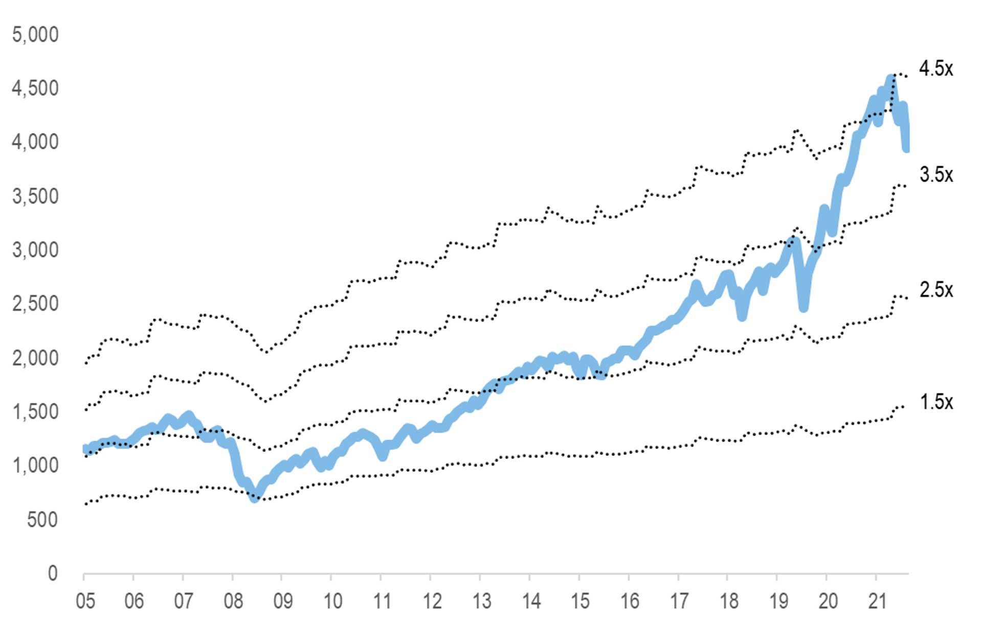 - 미국 증시의 경우 2022년 4월 말 기준으로 PBR이 3.86배로 2007년 이후의 평균(2.72배) 보다 약 41.4% 높은 수준이기 때문에 아직은 매력적인 레벨이라고 판단하기는 어려울 것 같다.