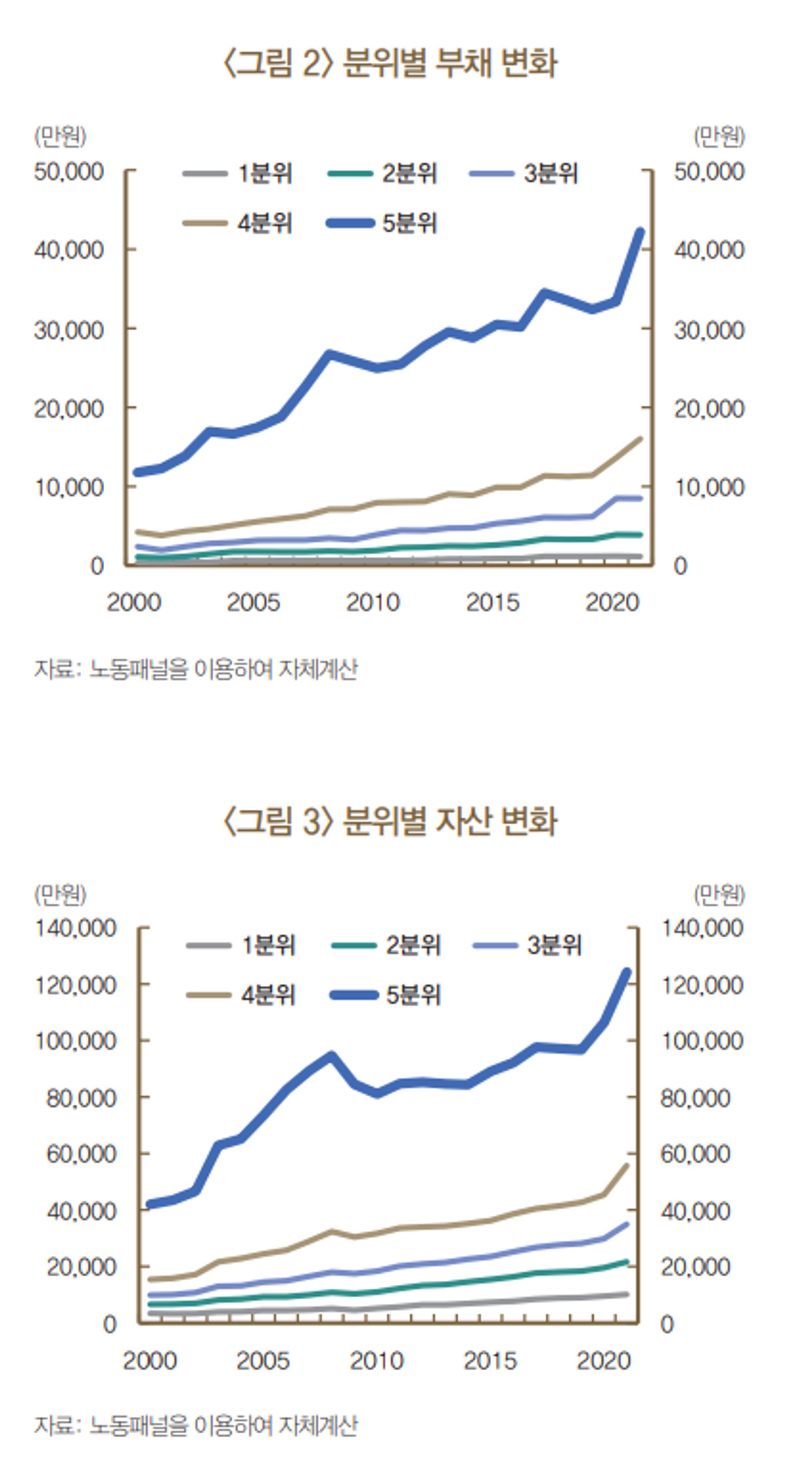 논란이 제기되는 가장 큰 이유는 바로 대출을 받는 사람들 대부분이 부유층이기 때문입니다. 아래의 <그림 2>는 소득 분위별 부채의 변화를 보여주는데, 압도적으로 고소득층(5분위)이 주도하고 있음을 발견할 수 있습니다.