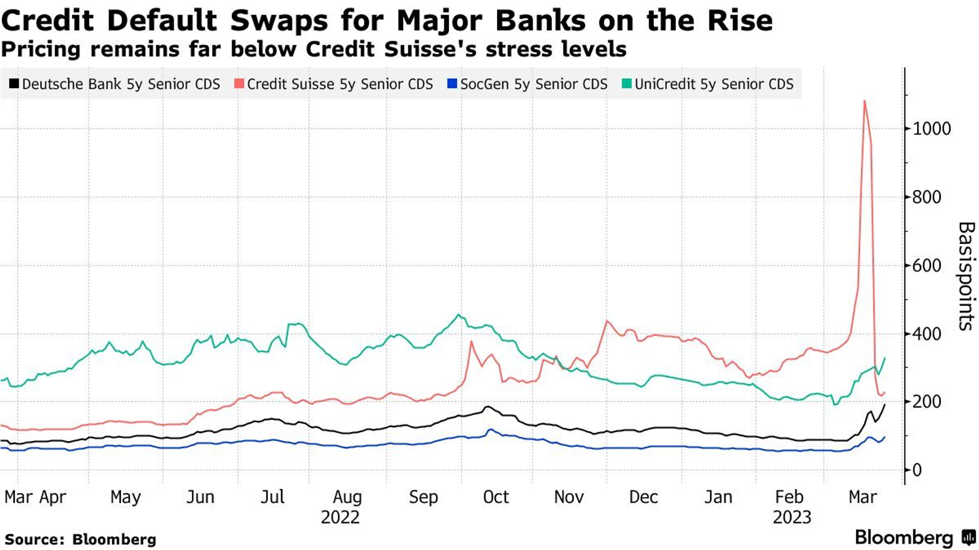 도이체 뱅크의 어려움은 크레딧 스위스 위기와 함께 시작되었습니다. 어떤 은행이나 기업의 신용도를 판단할 때 가장 많이 보는 것이 신용등급이지만, 신용등급은 정기 평가 혹은 신규 발행 시에 정해지면 자주 바뀌지 않으니(물론 수시 평가도 있습니다) 투자자들은 신용부도스왑(CDS) 프리미엄에 주목합니다. CDS 프리미엄이란, 일종의 지급 보증 수수료라 할 수 있습니다. 기업의 파산 위험이 높아지면 보증 수수료가 높아질 것이고, 안정적이라 생각되면 보증 수수료는 내려갈 것입니다.