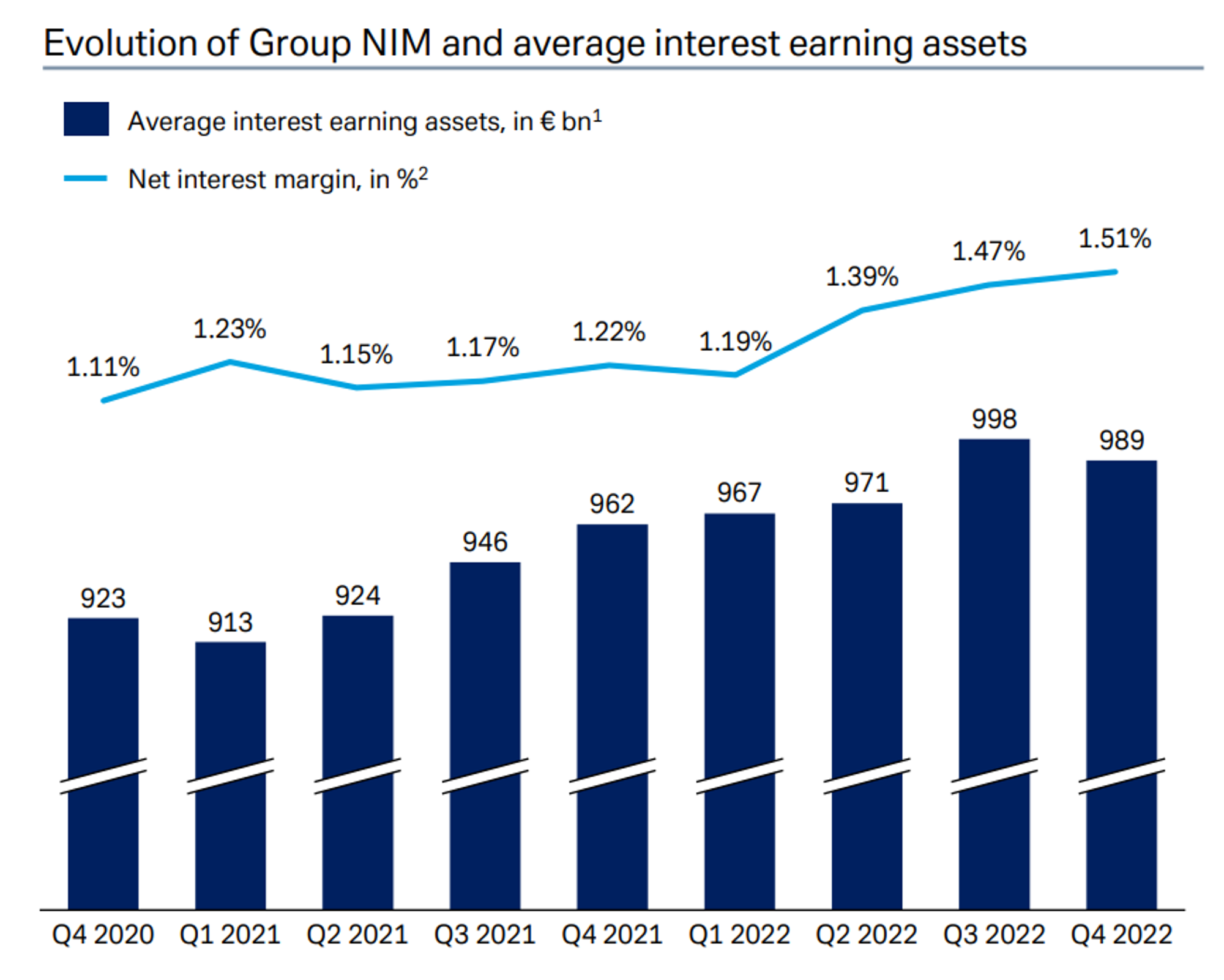 이렇게 높은 자기자본비율을 유지할 수 있는 이유는 '돈을 잘 벌기 때문'입니다. <표 1>에 나타난 것처럼, 2022 회계연도 순이익이 18.0억 유로이니 수익성이 꽤 높은 은행이라 하겠습니다. 이렇게 돈을 잘 버는 이유는 순이자마진(NIM)이 날이 갈수록 확대되고 있는 중입니다. 순이자 마진이란, 기업의 대출이자와 예금이자 차이를 뜻합니다. 정확하게는 여기에 충당금 설정 비용 등을 포함한, 대출로 인해 발생하는 수익이라 볼 수 있습니다.