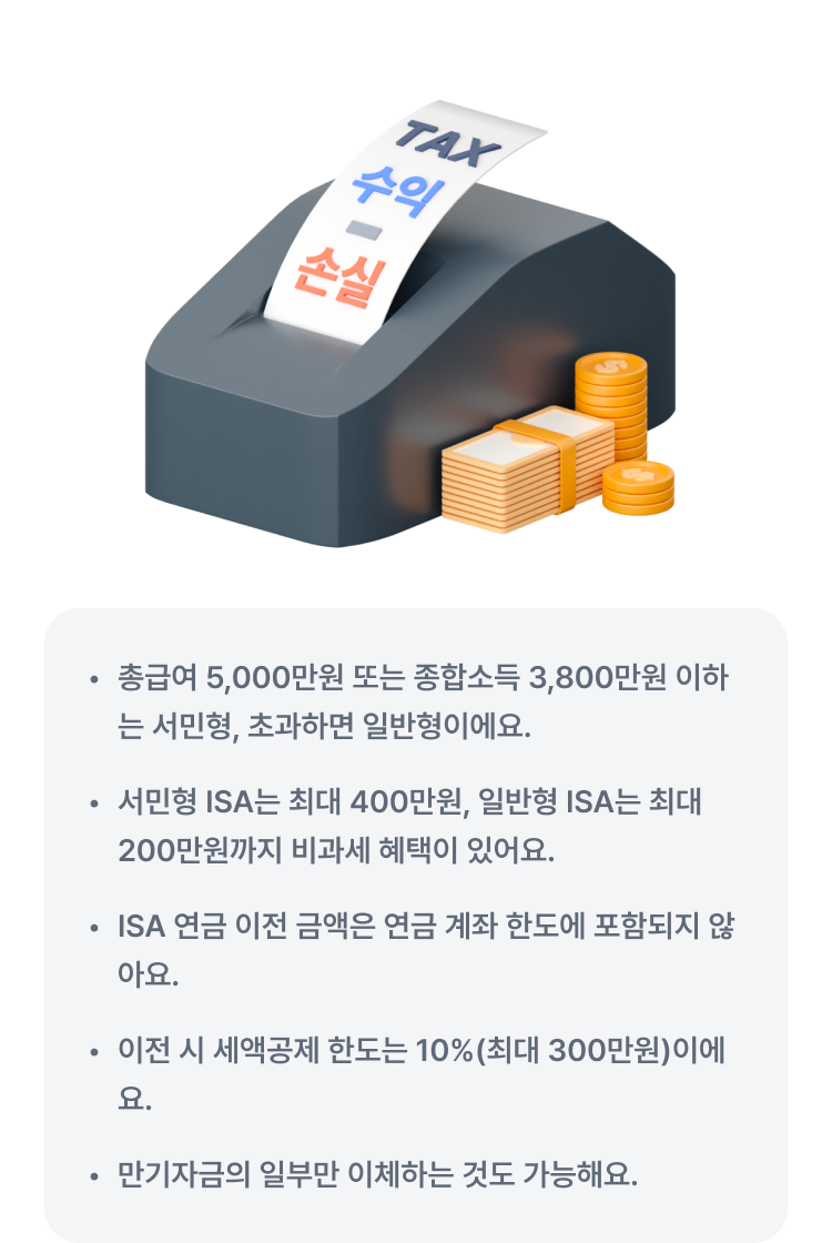 연금에 넣어 세액공제를 받는 것은 좋지만 집,결혼 등 등... 돈 들어갈 일이 많아 인출 제한이 부담스럽다면, 비과세 계좌 ISA에 투자하는 건 어떨까요?