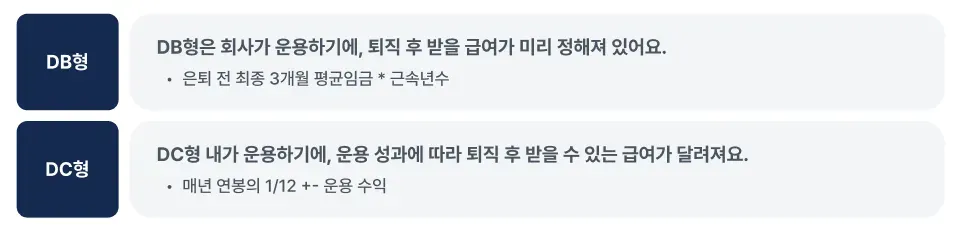 - 수익률의 주도권: 회사가 운용하고 정해진 금액만 받는 DB형(확정급여형)과 내가 직접 운용하여 성과를 내는 DC형(확정기여형)은 퇴직연금의 성격이 다릅니다.