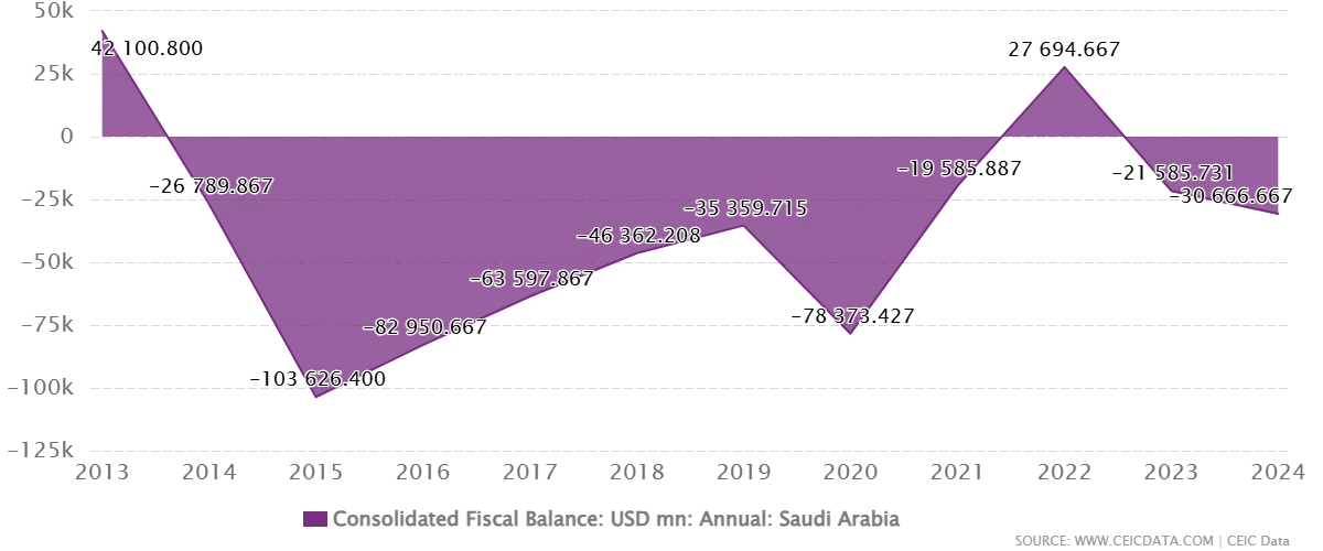 성장률은 낮은데 재정 적자도 지속되고 있습니다. 2024년 기준 GDP 대비 -2.6% 재정 적자를 기록하며 부채가 쌓이고 있습니다. 게다가 2025년에도 앞서 말한 원유 가격 하락과 감산의 여파로 재정 적자가 지속될 것으로 예상됩니다.