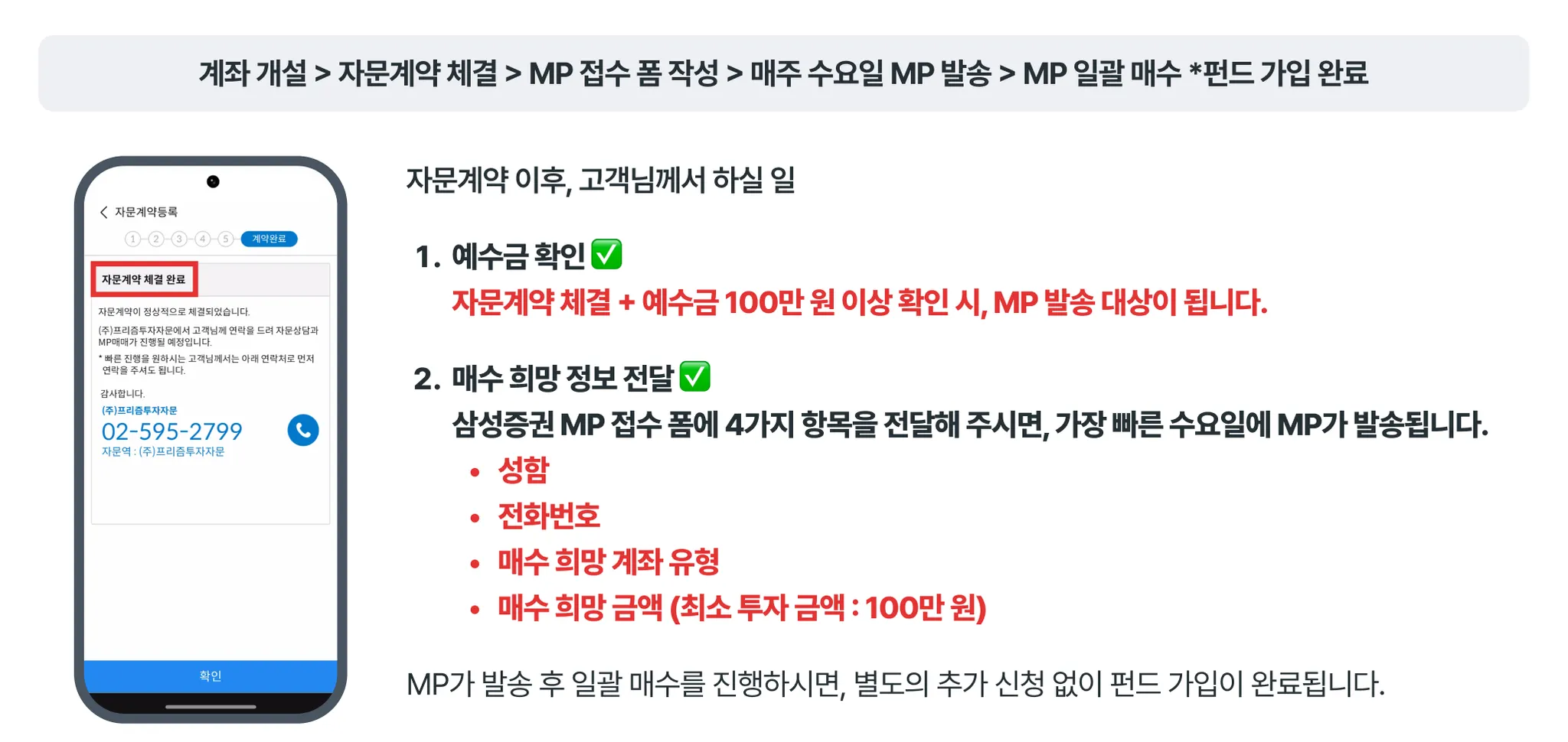 A. 매주 수요일 펀드 MP가 발송됩니다. 자문계약 후, 접수 폼을 작성해주세요.