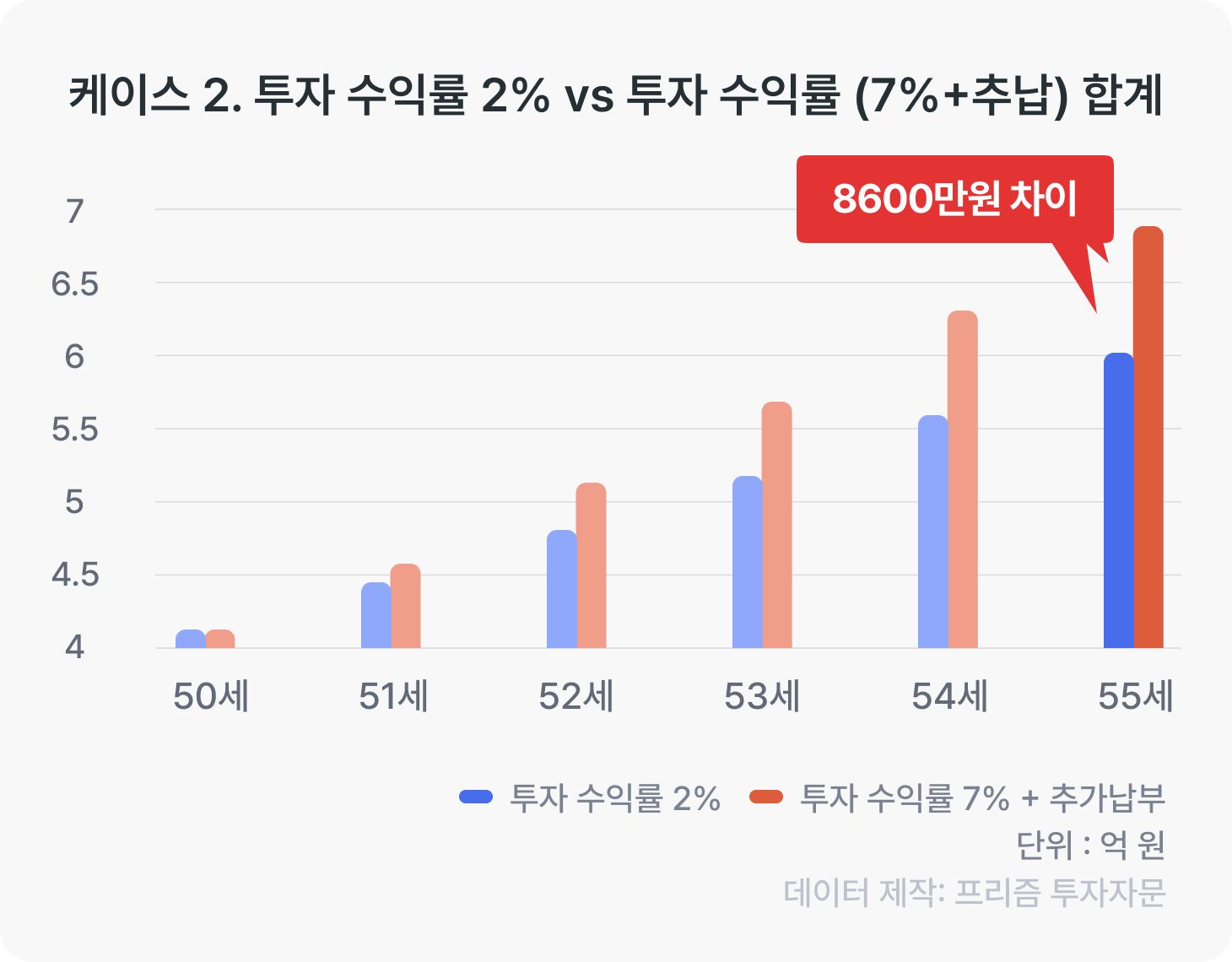 <케이스 2. 5년동안 연금 추납O 7% 수익률 (빨강) vs 추납X 2% (파랑) 수익률 비교하기>