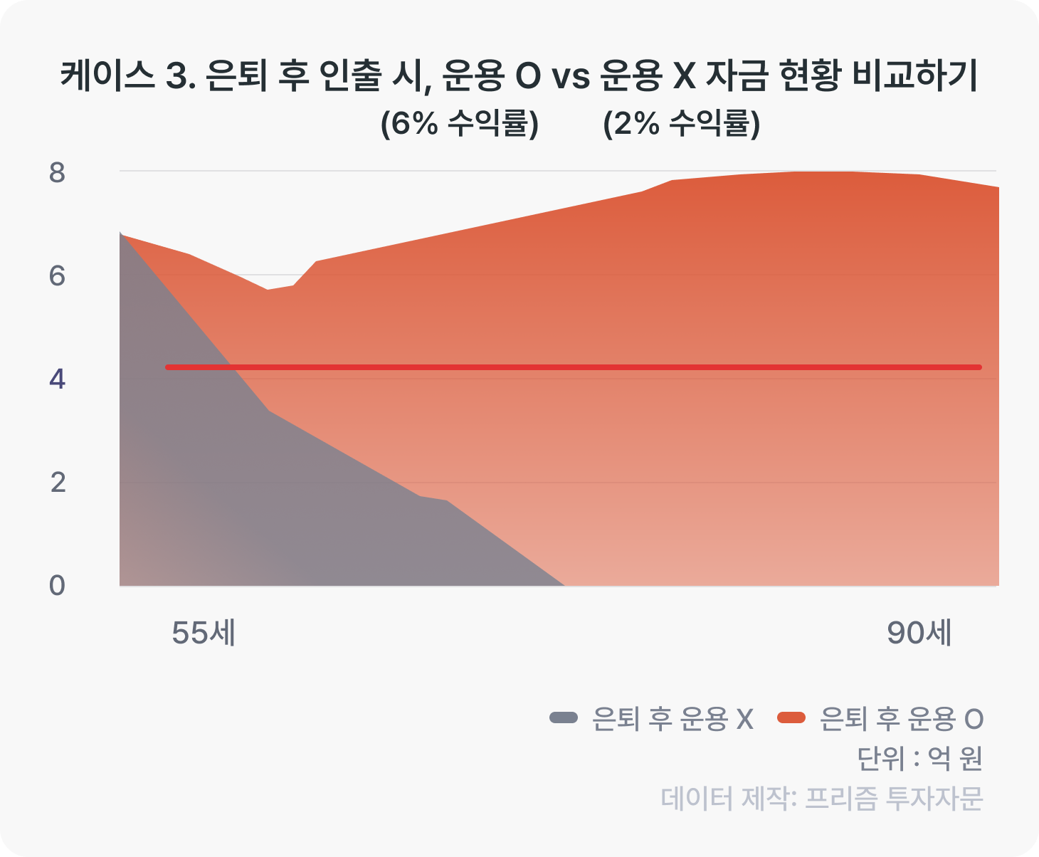 <케이스 3. 은퇴 후 인출 시, 운용O (6%수익률) vs 운용X (2%수익률) 자금 현황 비교하기>