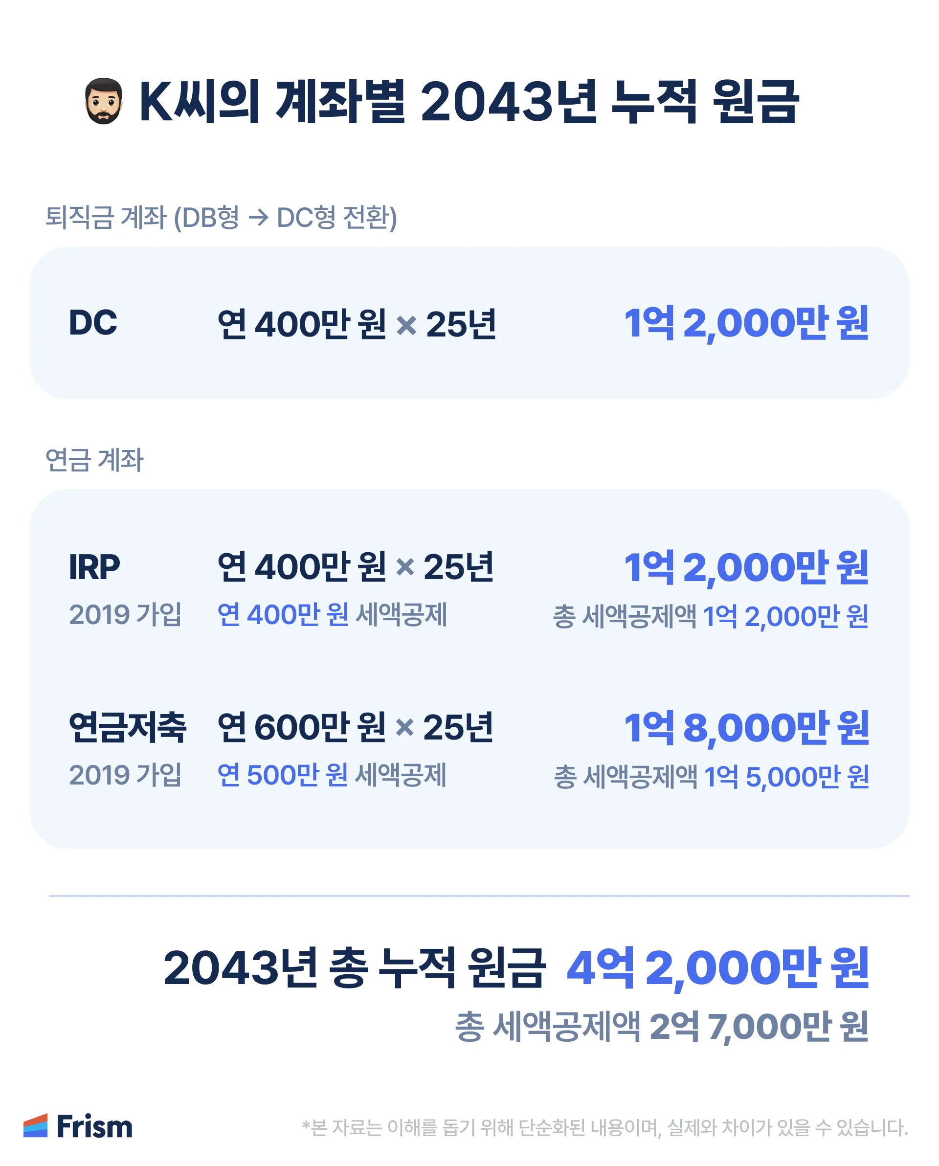 - 25년간 평균 연 급여 4,800만원 중 1,000만원(약 21%)을 사적 연금계좌에 꾸준히 적립하여 원금만 4억 2,000만원이 쌓였어요.