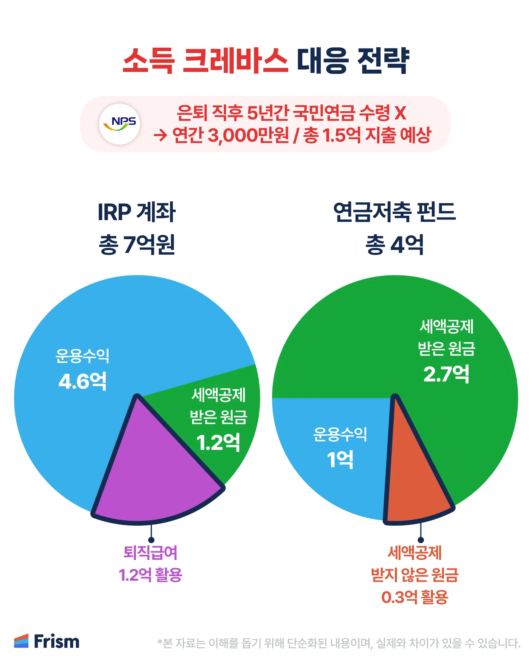 - 세액공제 받지 않은 원금(인출 1순위) 0.3억과 퇴직급여(인출 2순위) 1.2억 활용