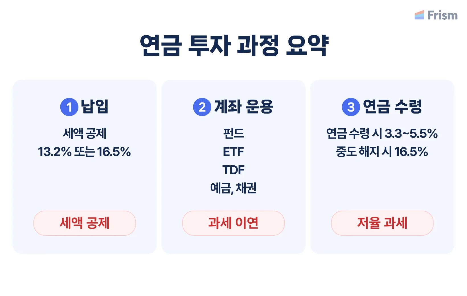 - 저율 과세: 연금 수령 시 3.3~5.5%의 저율로 과세
