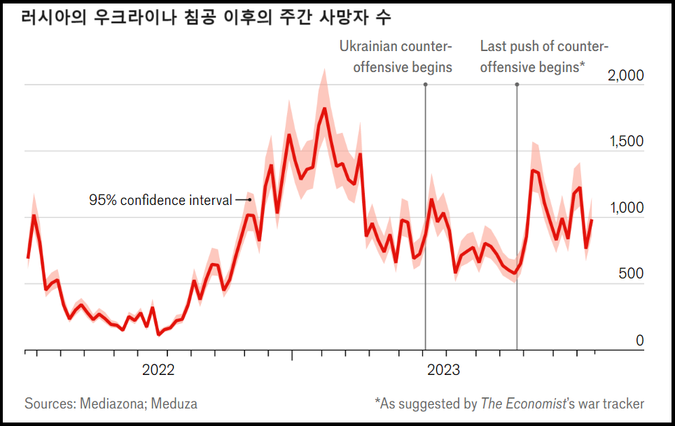 더 나아가 전쟁이 장기화되면서, 추정 기관에 따라 숫자가 달라지는 합니다 만, 전쟁에 참전한 러시아 군인의 사망자가 적게 잡으면 6만 6천 명에서 많게 추정하는 곳(미국 정부)은 12만 명에 이르는 것으추산됩니다(출처: Economist(2024.2.24), “How many Russian soldiers have died in Ukraine?”).