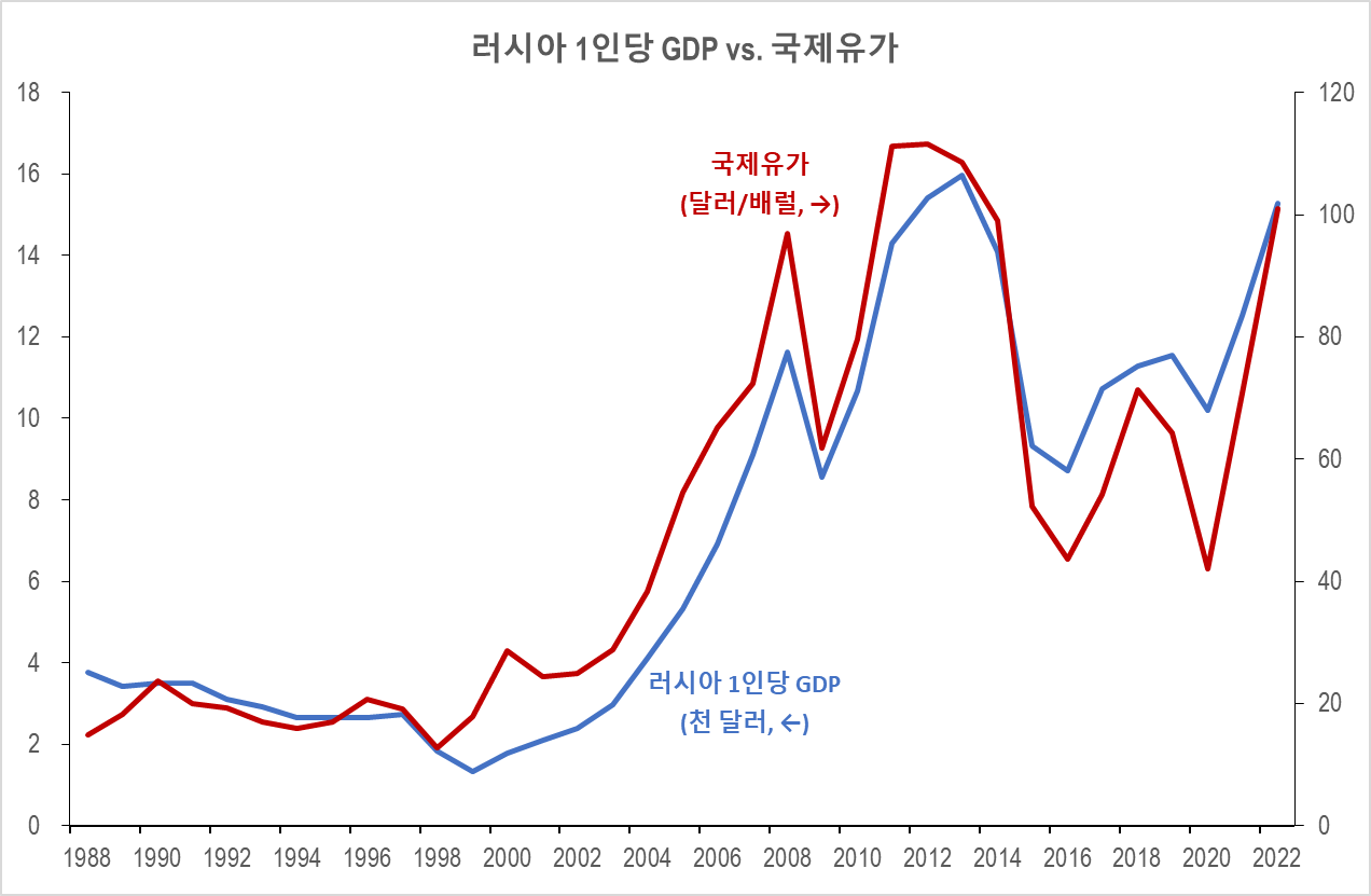 아래 <그림>은 국제유가(WTI 기준)와 러시아의 1인당 GDP 흐름을 보여주는데, 러시아는 기본적으로 산유국이라는 것을 알 수 있습니다. 물론 EU를 비롯한 주요 선진국은 러시아 산 원유의 수입을 금지하고 있습니다 만, 이게 구멍이 숭숭 뚫린 규제라는 게 문제입니다.