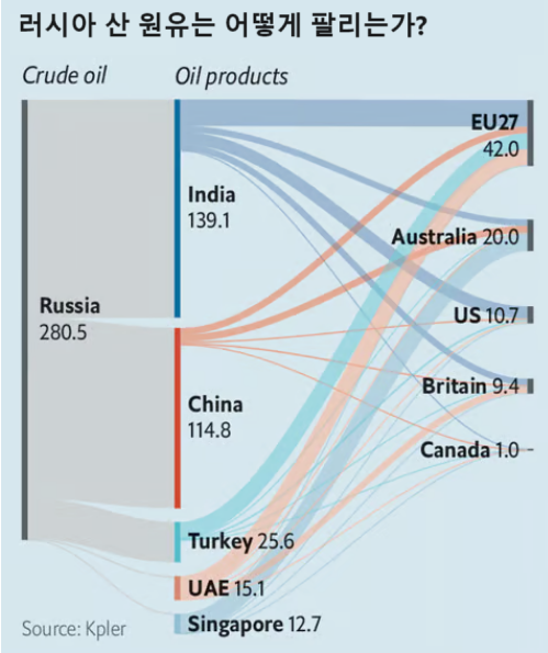 러시아에서 생산된 원유는 주로 인도와 중국으로 팔려가며, 이게 다시 유럽과 호주 그리고 영국 등으로 가공/수출됩니다. 인도와 중국 다음으로는 투르키예와 UAE 그리고 싱가포르 순서입니다(출처: Economist(2024.2.21), “Russia outsmarts Western sanctions—and China is paying attention”).