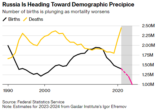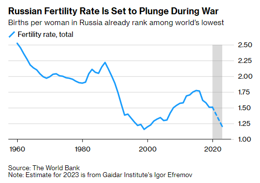 최근 발간된 블룸버그의 기사(Putin's War Escalation Is Hastening Demographic Crash for Russia)에 따르면, 2022년 러시아의 신생아 숫자는 130만 명에 그치고 2023년에는 100만 명을 하회할 것이라고 합니다. 우크라이나 침공 이후 적게는 5만 명, 많게는 15만 이상의 젊은이들이 숨지거나 실종된 것을 감안할 때 이는 러시아 인구의 감소 흐름을 가속화시킬 요인으로 작용할 것입니다.