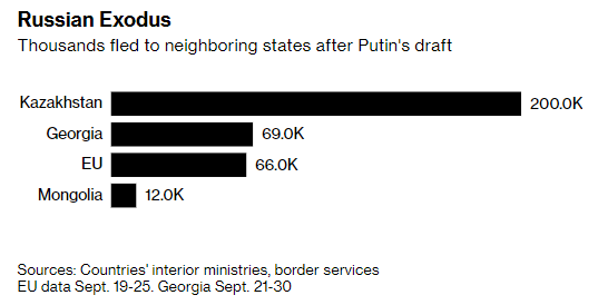 사망자의 숫자 뿐만 아니라, 신생아 숫자가 급격히 줄어드는 이유도 결국 젊은 남성인구의 감소에서 찾을 수 있습니다. 징집을 피해 해외로 이주는 이들이 급격히 늘어났기 때문이죠. 아래 <그림>은 러시아에서 해외로 도피한 젊은이의 숫자를 보여주는데, 카자흐스탄으로만 무려 20만 명 이상이 이동했음을 발견할 수 있습니다.