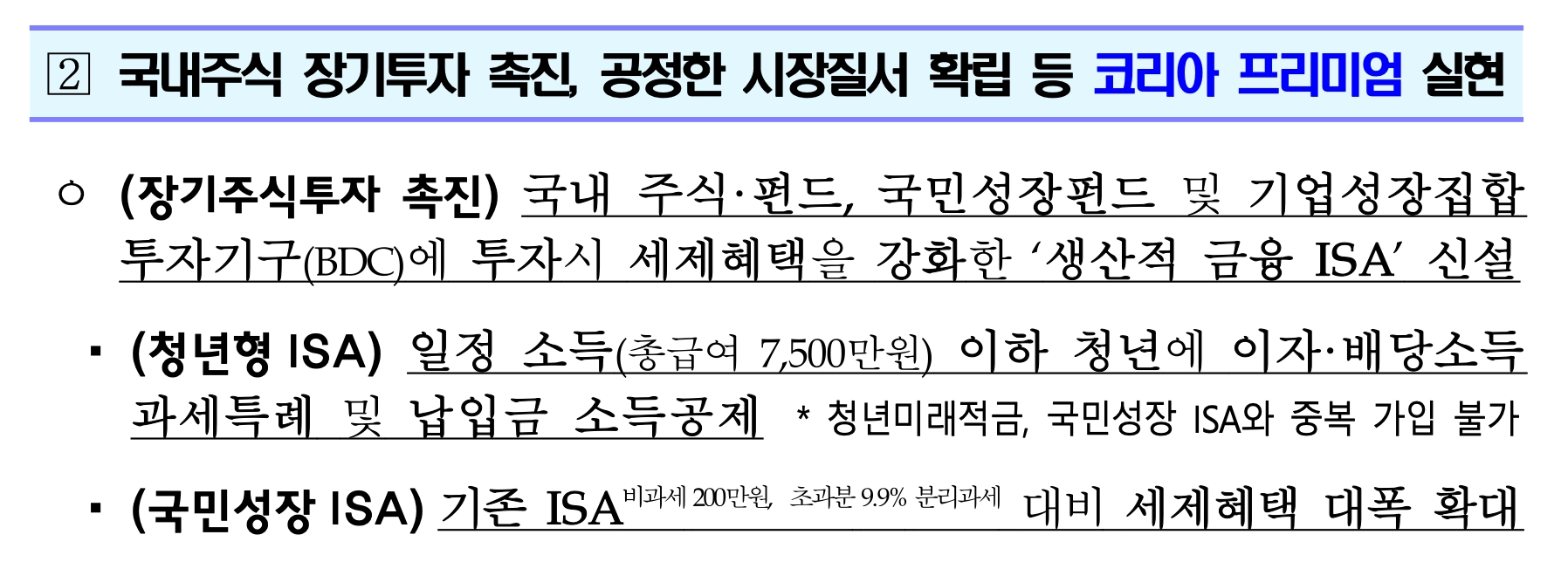 기존 ISA보다 큰 세제 혜택을 제공하여 개인 투자자에게는 자산 형성의 기회를 제공하고, 국가적으로는 우리 자본시장의 체질을 개선하여 '코리아 프리미엄'을 완성하기 위함이라고 볼 수 있죠.