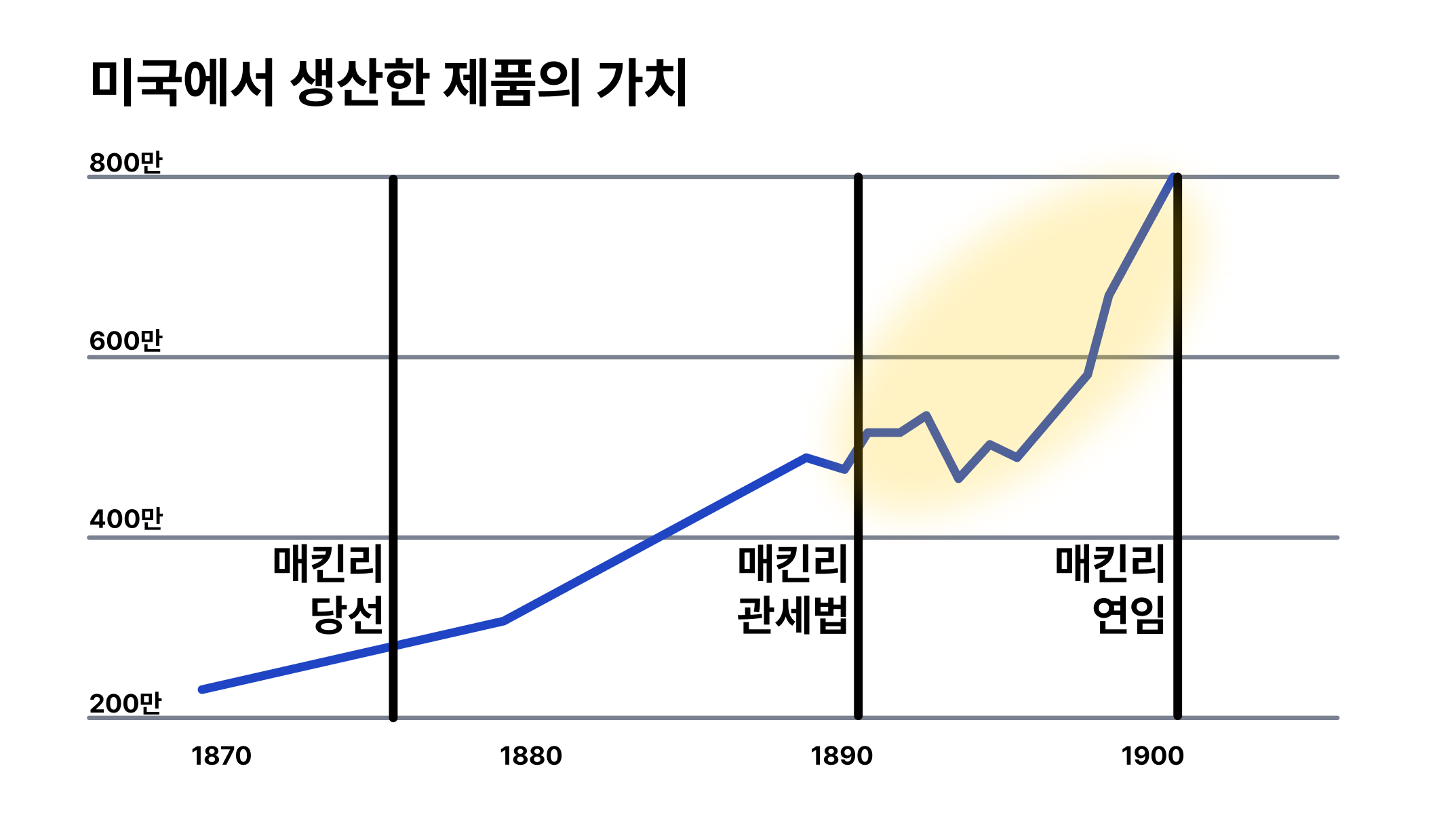 매킨리 대통령은 결국 높은 관세율과 보호무역주의를 통해 수입품을 줄이고 재정을 효과적으로 관리하는 데에 성공했습니다. 보호무역주의의 장점인 국내 산업 발전까지 성공하면서, 당시 매우 중요했던 제조산업과 기술력이 성장할 수 있는 발판을 만들었습니다.