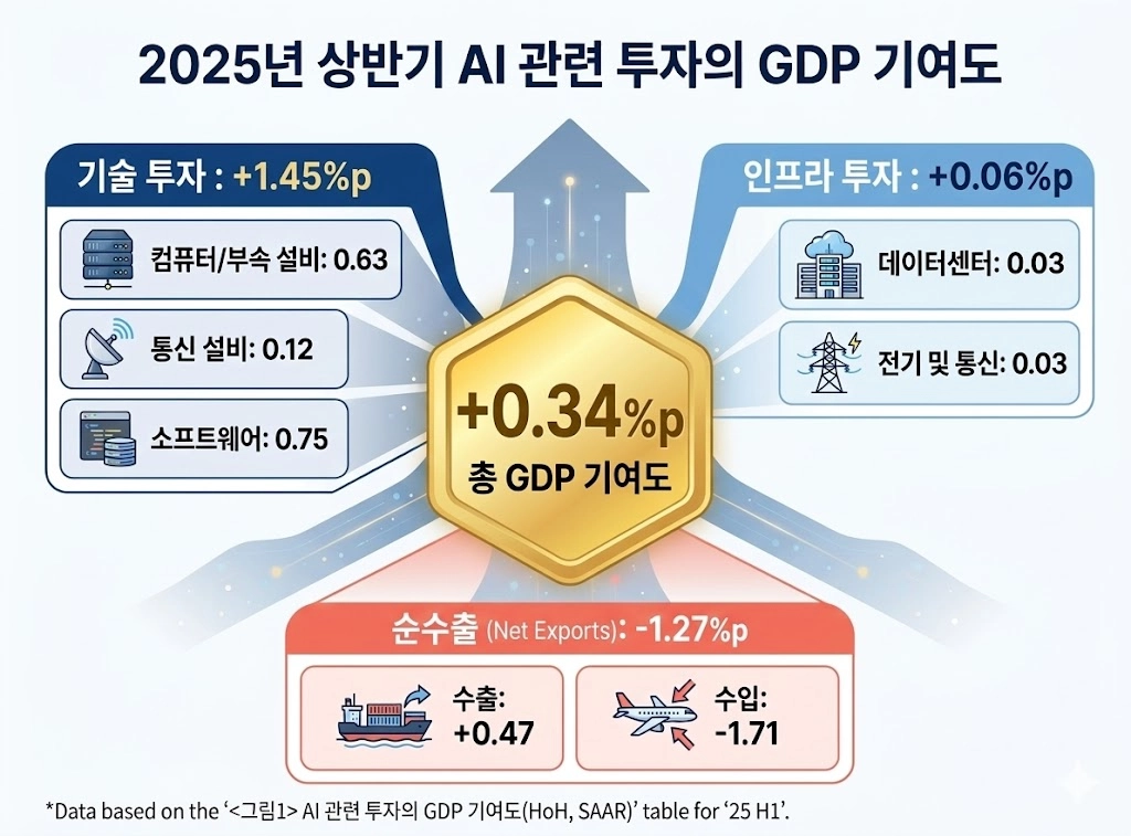 이러한 관세의 악영향에도 불구하고 미국 경제 성장률은 AI(인공지능) 관련 투자가 지탱하고 있습니다. 2025년 상반기 GDP 성장률(HoH 1.57%) 중 AI 관련 분야가 기여한 비중(0.34%p)이 무려 22%나 된답니다!