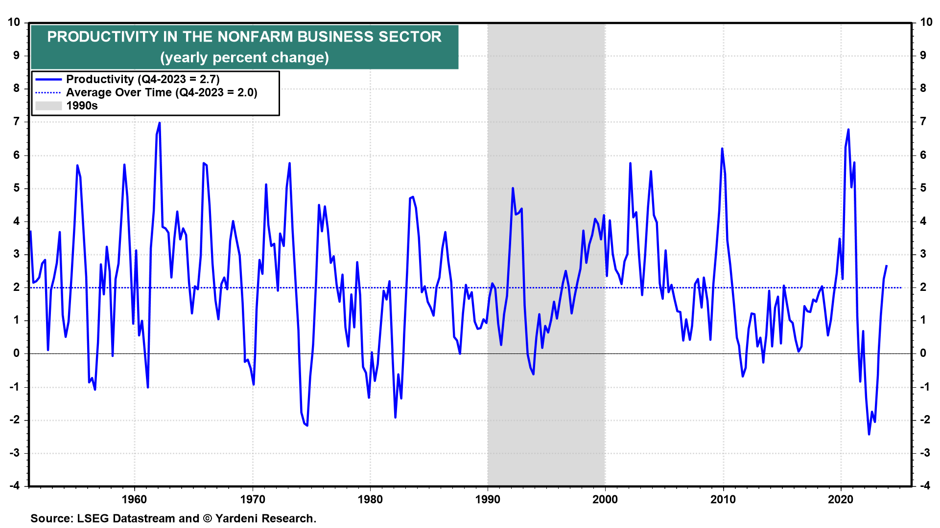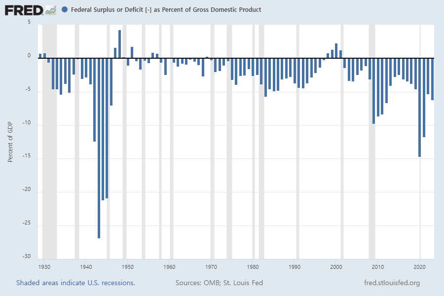 미국 연방정부 재정수지가 악화되고 부채가 급증한 것은 분명한 사실입니다. 그러나 이게 생산성 향상 속도의 둔화로 이어졌는지는 뚜렷하지 않습니다. 가장 대표적인 사례가 1970년대로, GDP 대비 정부 부채는 줄었지만 생산성은 크게 개선되지 않았습니다. 반대로 1990년대 전반 걸프전 영향으로 정부부채가 급증했지만, 정보통신 혁명에 힘입어 생산성의 비약적인 증가가 나타났죠. 2020년에도 마찬가지 현상이 나타났습니다. 트럼프 정부가 대규모 재정지출을 단행할 때, 생산성의 급격한 개선이 나타났죠.