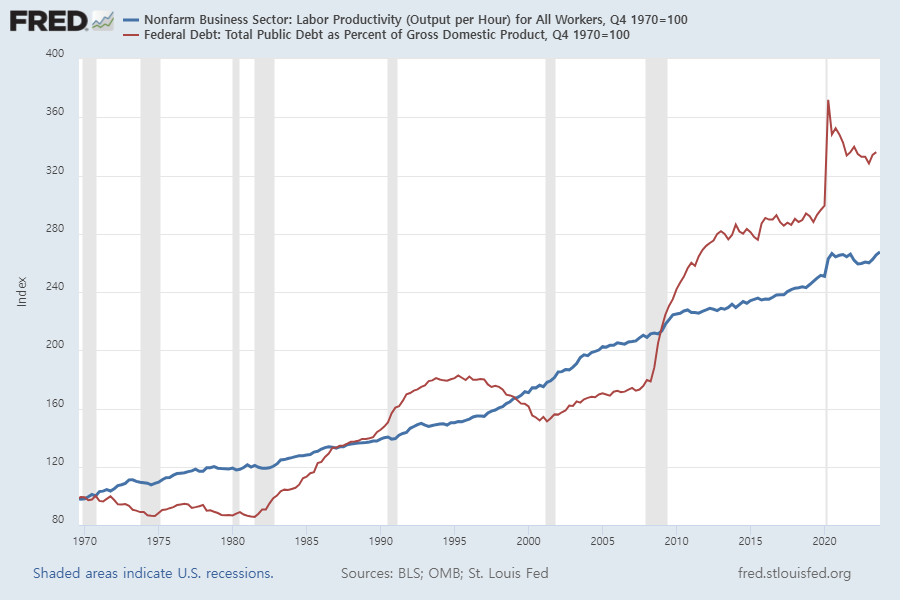 <그림> 미국 연방정부 부채(붉은선) vs. 비농업 부문 노동생산성(1970=100)