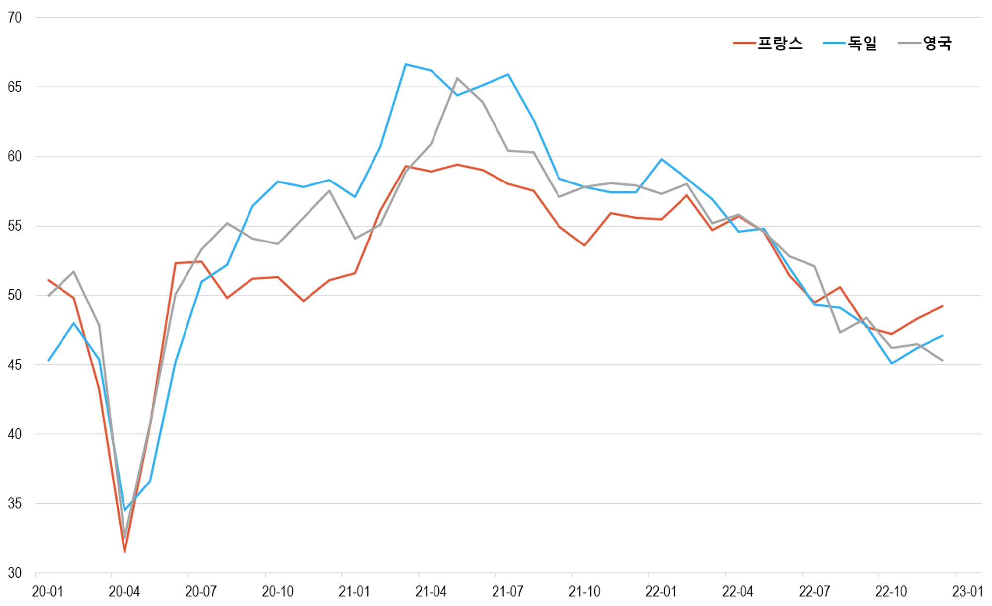 <그림 1> 유럽 주요국 PMI(%)
