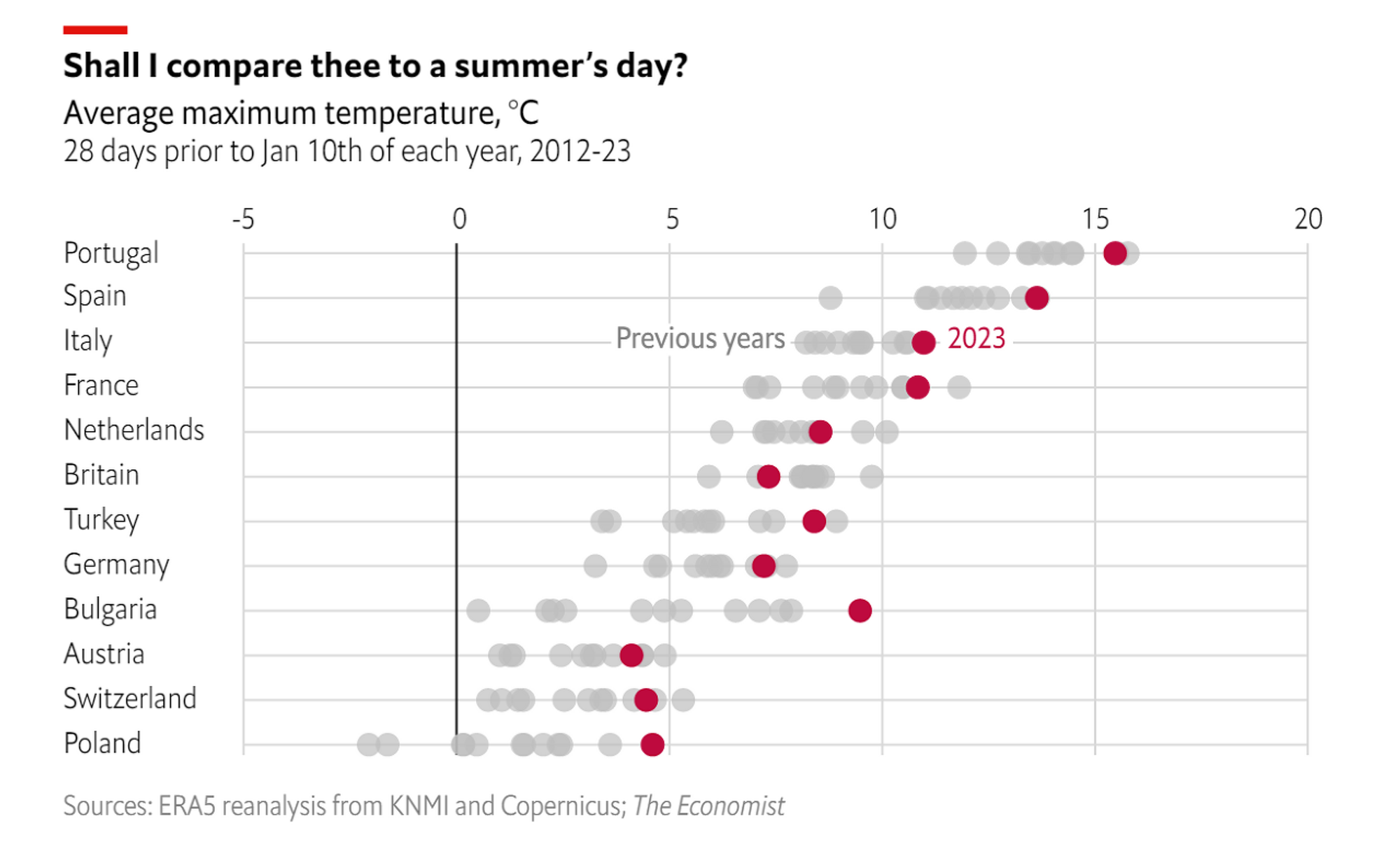 아래 <그림 2>는 2012~2023년의 1월 10일 이전 28일 동안의 평균 기온(’0’으로 표시)과 최근 기온의 차이를 보여줍니다. 대부분의 나라에서 지난 10년 중 가장 따뜻한 겨울을 보내고 있음을 발견할 수 있습니다. 심지어 포르투갈은 평년 기온보다 15도가 높고 영국은 7도 이상 높다고 합니다.