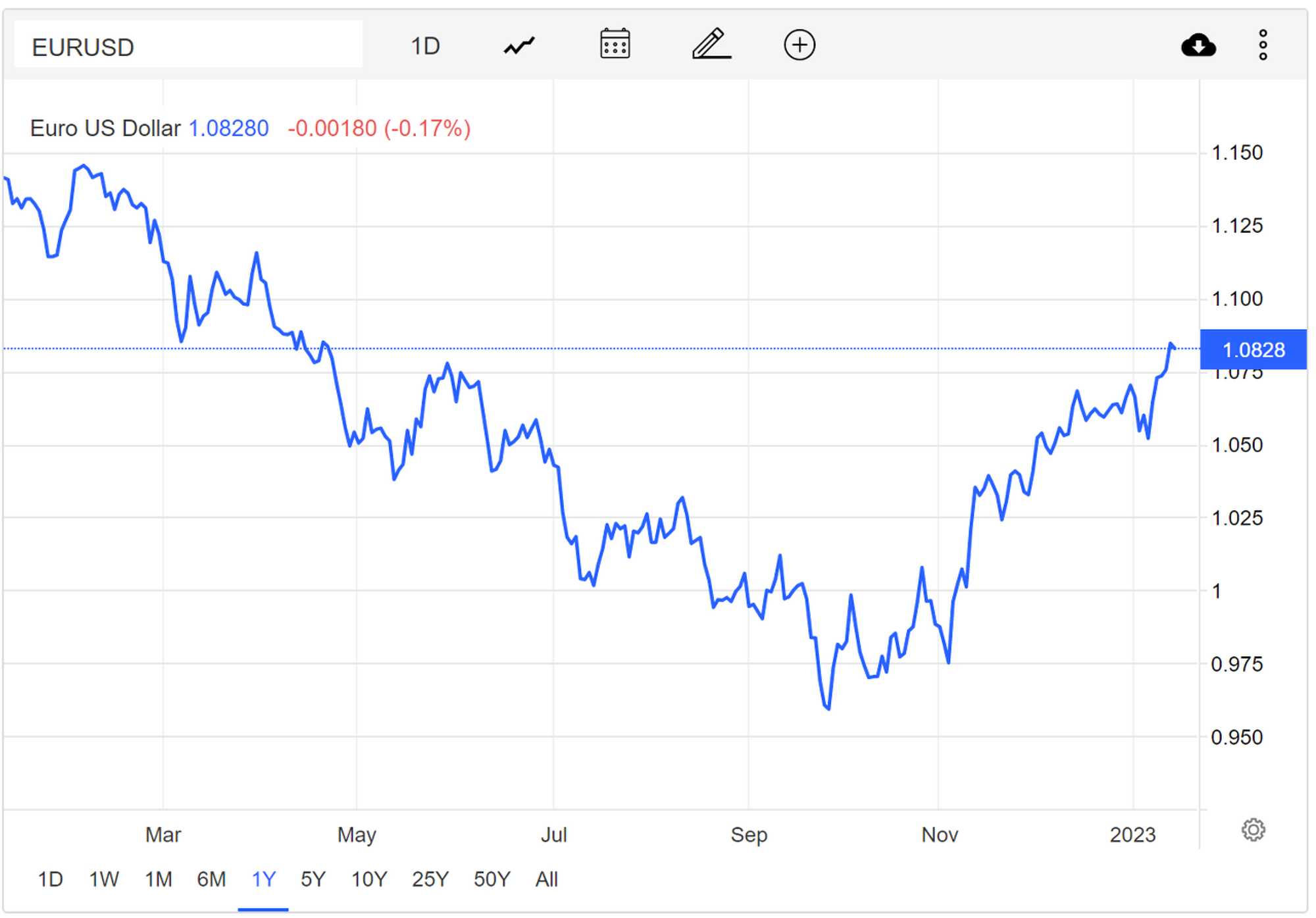 <그림 4> 지난 1년 동안의 유로에 대한 달러 환율