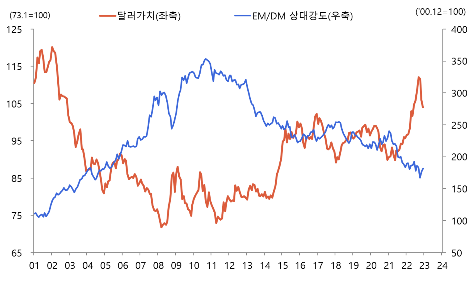 <그림 5> 달러 가치와 신흥국/선진국 증시 상대 강도